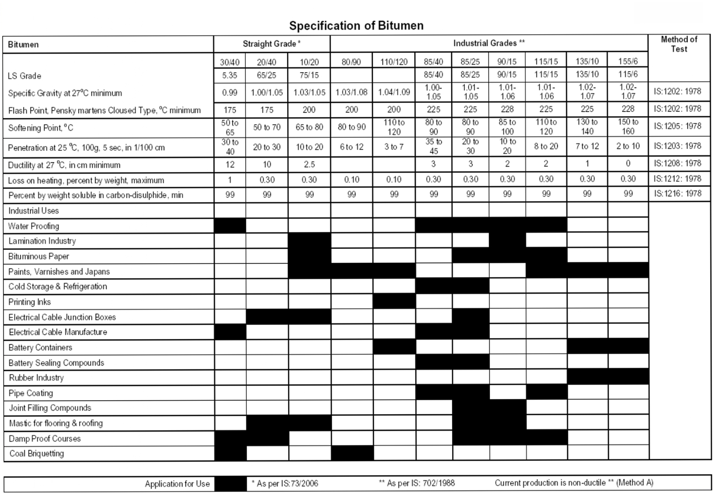 Industrial grade bitumen is used in waterproofing, damp proofing, acid/alkali resistant, subflooring, canal lining, road construction, joint fillers, lamination, battery sealing, a base for cable joining compound and manufacturing of paints, printing inks, explosives etc.
